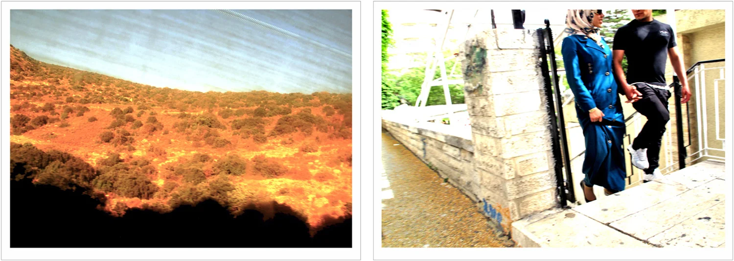 Image 2: (Left) Local Time 16:15 hrs. May 29, 2013 “Landscape through a train window: inside the Green Line”, 31°49' N 34°59’ E. (Right) Local Time 14:00 hrs. June 2, 2013 “Love in Ramallah”, Area A, The Occupied Territories of the West Bank